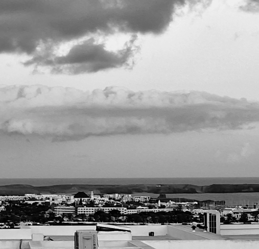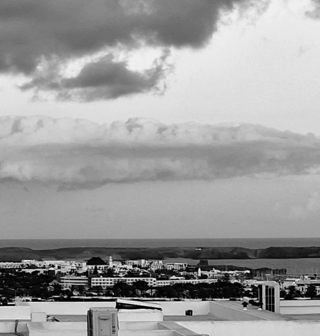 Berghänge, über die unterhalb liegende Stadt Playa Blanca auf die